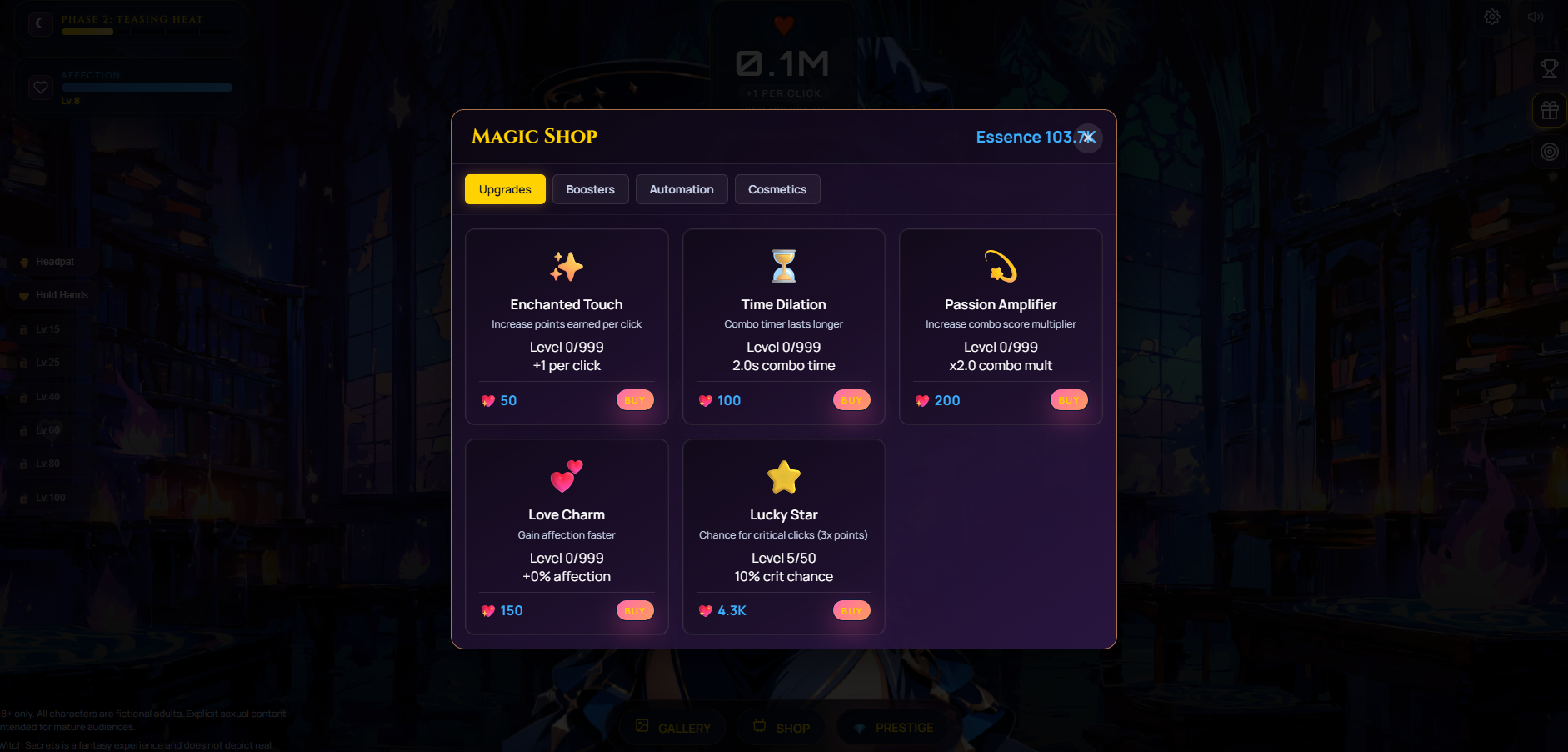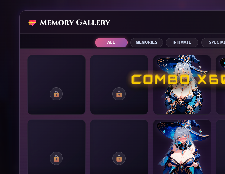 We move through phases together, your affection climbing higher with every stroke of devotion. Each new level peels away another layer… until the memories bloom in my gallery, every intimate scene glowing, waiting for your eyes only.